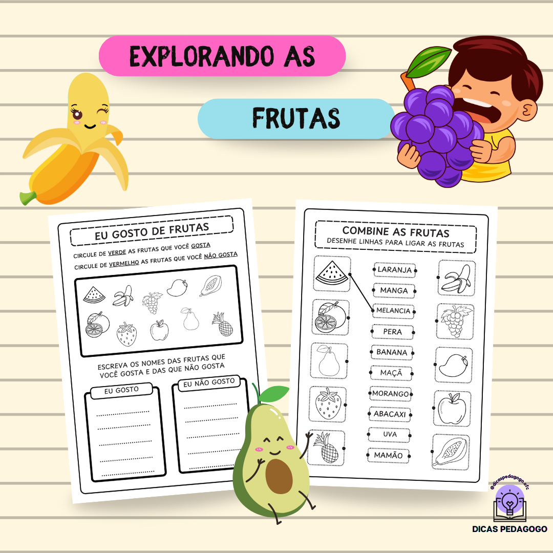 No PDF, as educadoras encontrarão uma variedade de atividades. As crianças poderão relacionar as frutas aos seus nomes, colorir os desenhos e até escrever o nome de cada uma delas. Além disso, uma atividade divertida permite que os pequenos circulem as frutas de que mais gostam!
