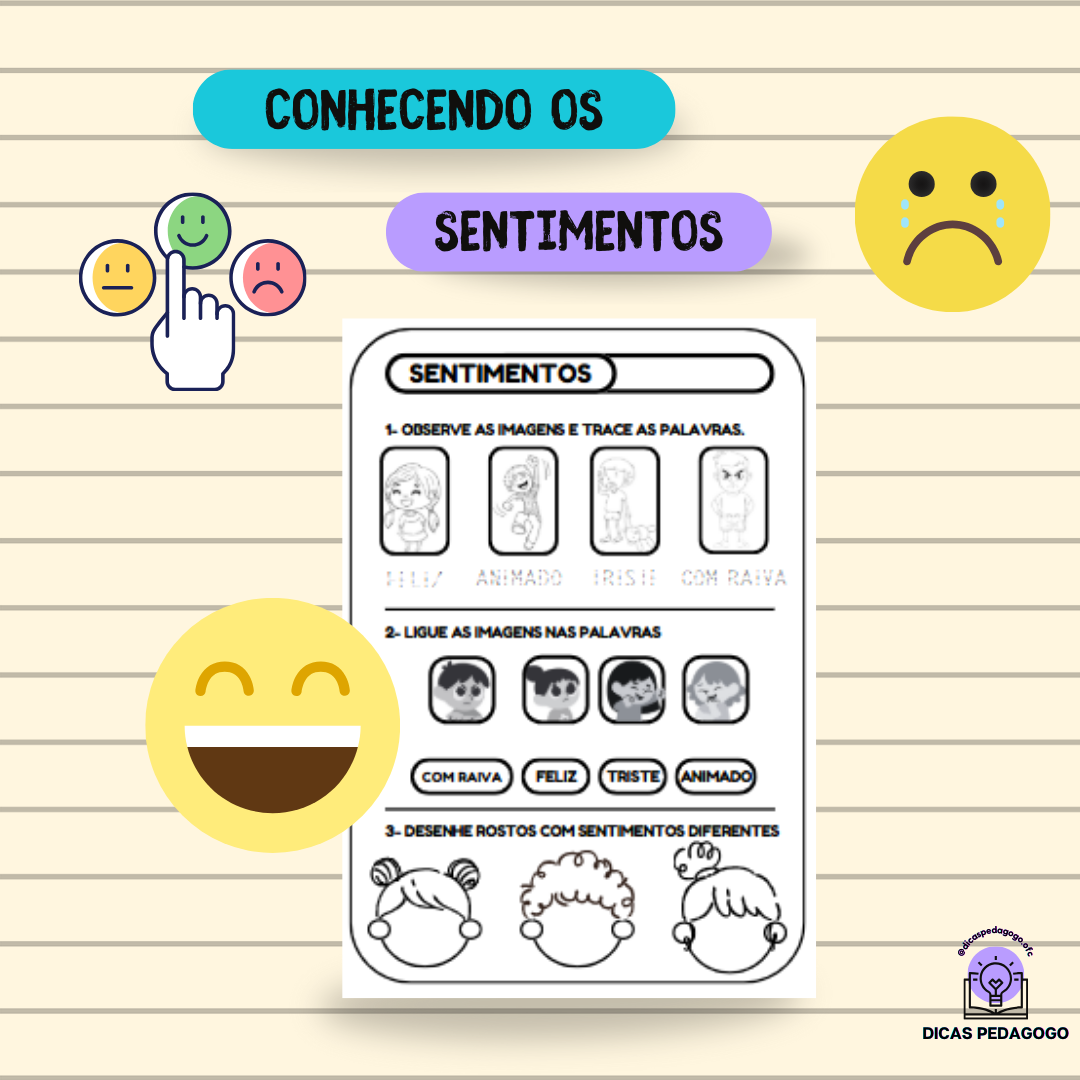 No PDF, as professoras encontrarão atividades envolventes, como escrever os nomes dos sentimentos e fazer conexões entre imagens e palavras correspondentes. Essa interação visual e linguística facilita a aprendizagem e a retenção dos conceitos.